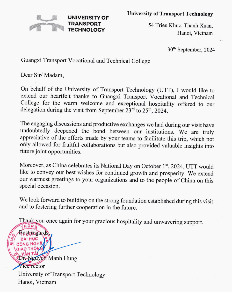 9月30日,PP电子收到越南交通运输技术大学的感谢信。该校代表团于9月23日至25日访问PP电子,双方就开展国际人才联合培养项目进行了深入探讨。信中,越南交通运输技术大学对PP电子在其代表团访问期间的热情接待与周到安排表示衷心感谢,高度肯定了此次访问对于加强两校合作的重要意义,表达了对未来深化两校合作的强烈意愿,并在国庆节来临之际,向中国及PP电子致以最诚挚的祝福。