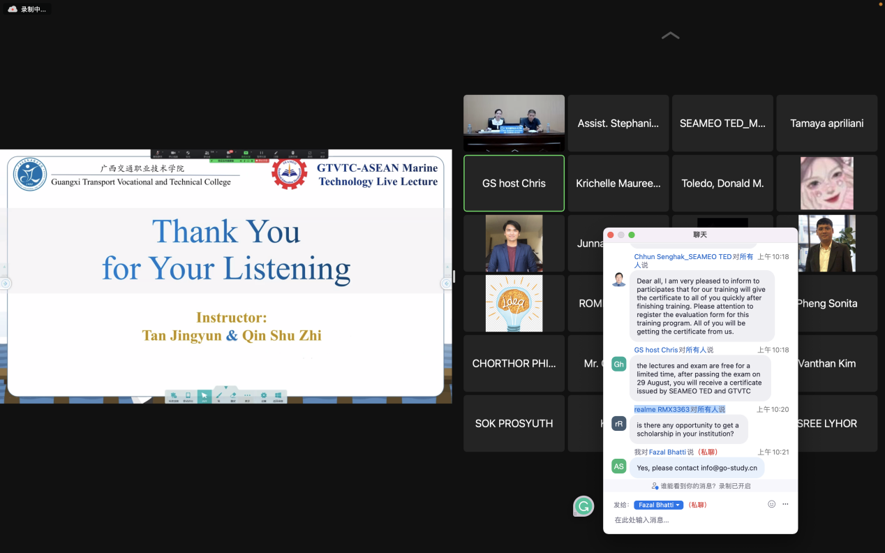 8月18日上午,东盟国际学院与航海工程学院通过中国-东盟技术教育合作平台进行了航海专业的首次线上国际培训。航海工程学院的谭婧昀和覃树枝老师出席了本次活动,以及来自菲律宾等东盟国家的150名学员参加了此次培训。