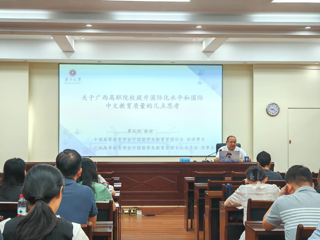 开班仪式后,广西高等教育学会留学生教育管理专业委员会覃成强教授为参训学员授课。