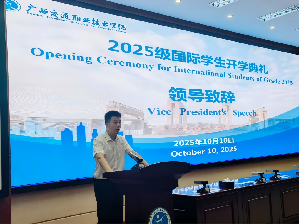邱实首先对新生的到来表示热烈欢迎。他指出,作为广西高校来华留学教育工作优秀单位,学校依托“四高四优”八大交通特色专业群,为留学生搭建了“中文+职业技能”的国际化培养平台。今年学校首次招收语言进修类留学生,招生规模创历史新高。
