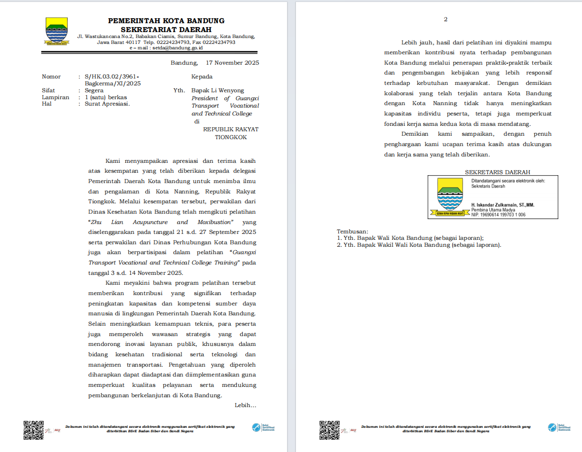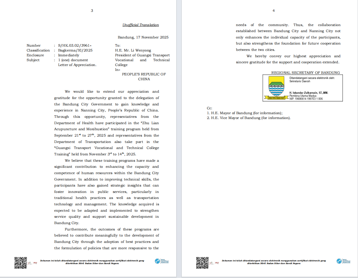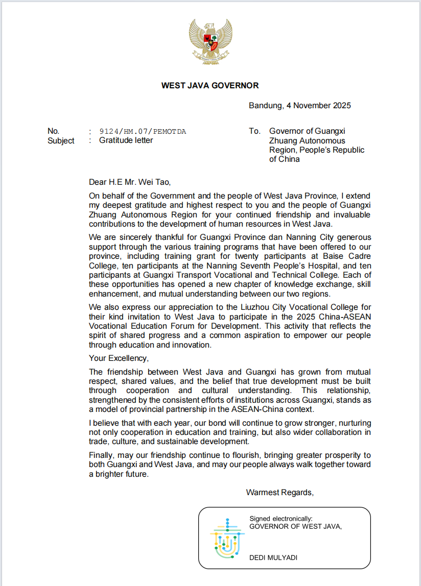 近日,西爪哇省政府致函广西壮族自治区主席韦韬和PP电子校长李文勇,对广西壮族自治区政府组织的各类培训项目和PP电子组织开展的交通技术培训项目表示感谢。西爪哇省政府在感谢信中提到,交通技术培训项目为提升西爪哇省政府工作人员的交通技术水平作出了重要贡献,不仅提升了学员新能源汽车与智慧交通领域的技术能力,还为两地建立了更为紧密的合作关系,为未来的进一步合作奠定了基础。