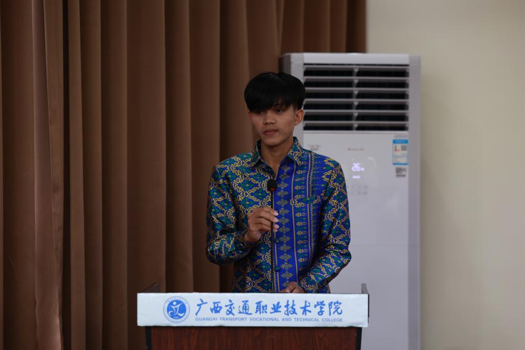 来自柬埔寨的2022级国际学生颜文能作为老生代表发言。他感谢学校对自己的培养和肯定,感谢老师对自己的帮助和鼓励,感谢同学们对自己的信任和支持。他分享了自己在学校学习和生活的经历,勉励新同学努力学习,在未来中国与本国的交流交往中用中文和职业技能铺路搭桥,共建美好世界。