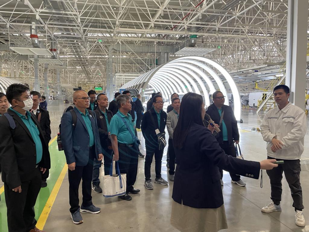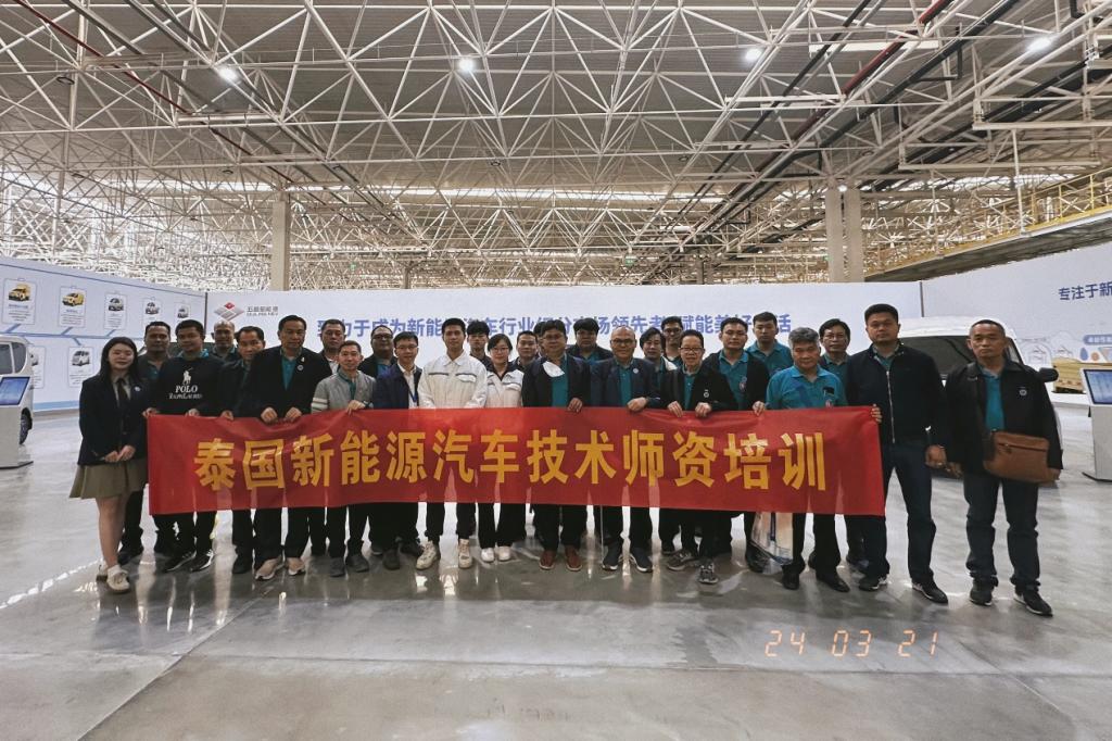 In order to observe and learn the structure and principles of new energy vehicles more intuitively, on March 21st, a team led by teachers from the College of Automotive Engineering and ASEAN International School, as well as trainees from Thailand's new energy vehicle technology teacher training, visited Guangxi Automobile Group's new energy vehicle base in Liuzhou. The staff of Guangxi Automobile Group introduced the production line of the new energy vehicle assembly factory to Thai teachers, and demonstrated the construction and assembly process of several new energy vehicles exported overseas.