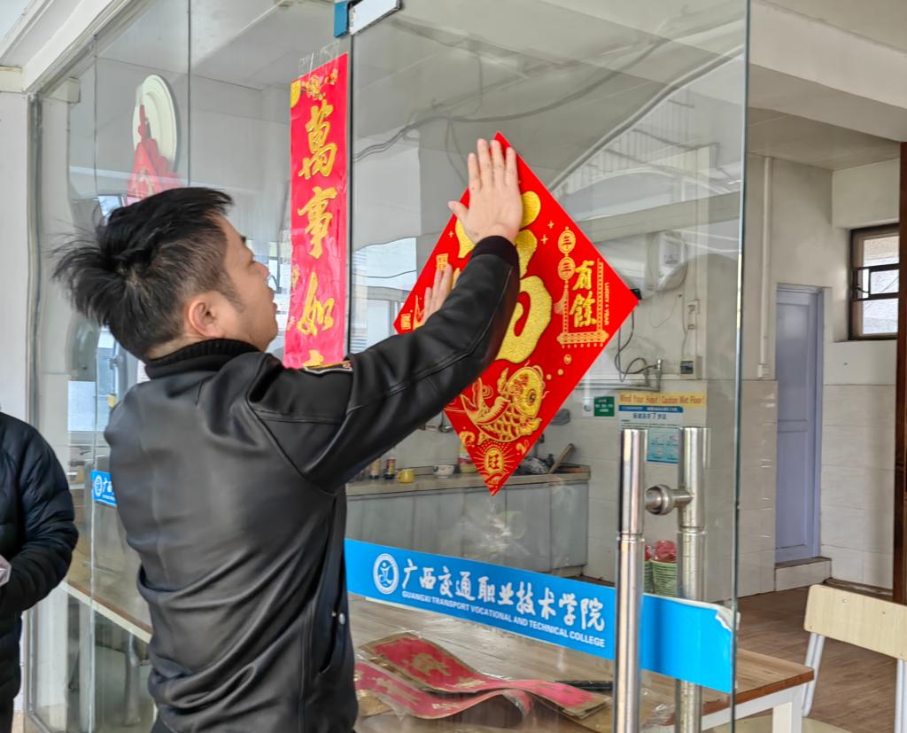 Huang Gang, Deputy dean of ASEAN International School, first visited the student dormitories to send warmth and blessings to the students who stayed on campus during the holiday. After caring about the life and learning situation of the students during the winter vacation, Deputy dean Huang Gang and the international students jointly pasted Spring Festival couplets and blessings, dressed up their dormitories to welcome the arrival of the new year.