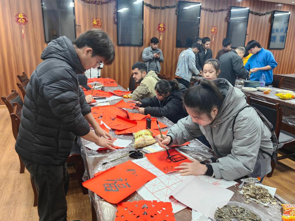 Subsequently, enter the cultural experience stage. In Classroom 707 of Yuanhu Campus, international students and teachers write the word "fu" together, cut window decorations, and experience the charm of traditional Chinese culture. In addition to writing the word "fu", the students also used brushes to write New Year greetings and blessings on red rice paper, fully demonstrating their love for Chinese calligraphy art.