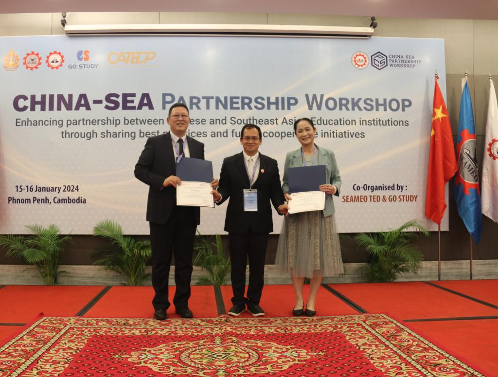 Due to the outstanding achievements of the College in the construction of ASEAN TVET platforms, promotion of international vocational education standards, and overseas vocational and technical training, from January 14th to 18th, at the invitation of the Southeast Asian Minister of Education, President Li Wenyong and his team of three went to Cambodia to participate in the first China Southeast Asia International Technical Education Cooperation Summit and Award Ceremony. The College has been awarded the title of Outstanding Collaborative Partner, Professor Mo Xiaonong has been awarded the title of Outstanding Project Management, and Teacher Wen Shaochun has been awarded the title of Exemplary Dedication Teaching. It is the only Chinese the College to have won three international awards, reflecting the high recognition of our international education level in the field of vocational education in Southeast Asia and the profound influence of the College in the field of vocational education in Southeast Asia.