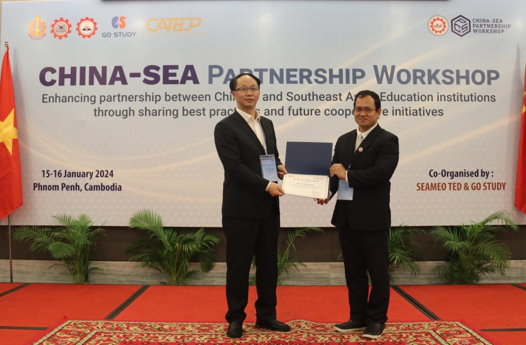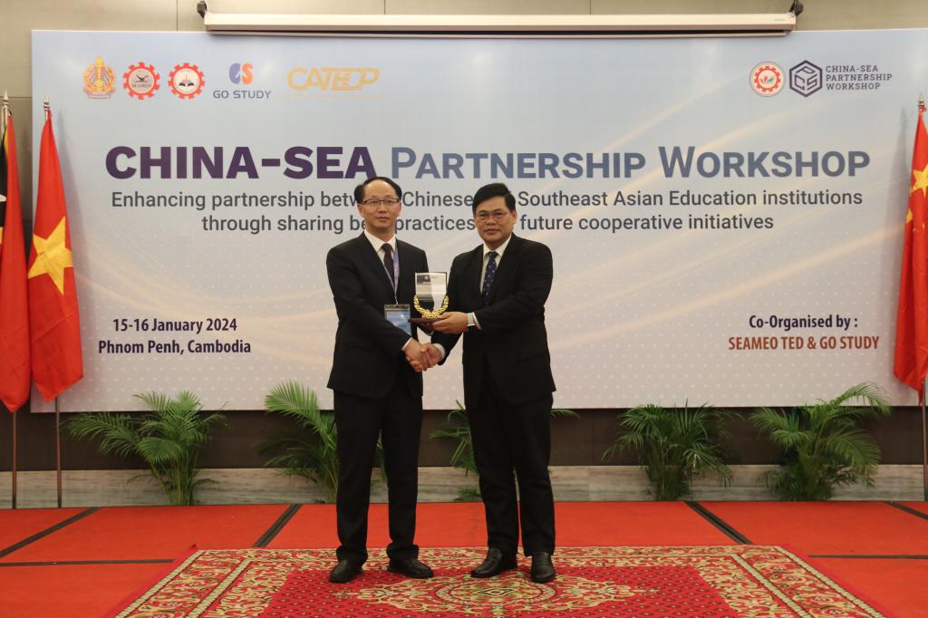 Dr. Songheang AI, Director of SEAMEO TED, presented Professor Mo Xiaonong with the "Outstanding Project Manager" award