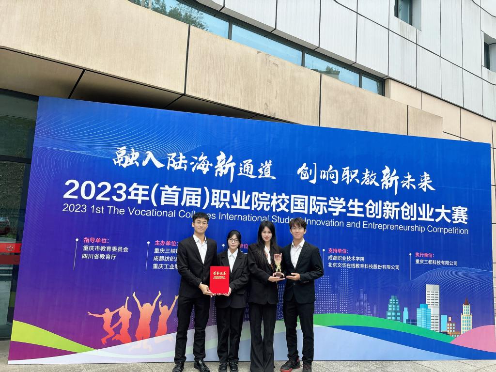 Recently, the final of the 2023 International Student Innovation and Entrepreneurship Competition for Vocational Colleges came to an end at Chongqing Three Gorges Vocational College. The competition "Promoting the Spirit of Chinese Craftsmanship and Helping Guangxi Wuling Hongguang Automobile to Build a Brand Image for ASEAN" jointly created by international students from the ASEAN International School and students from the School of Automotive Engineering of the College won the bronze medal in the 2023 Vocational College International Student Innovation and Entrepreneurship Competition, and the College was awarded the honorary title of "Excellent Organizational Unit".