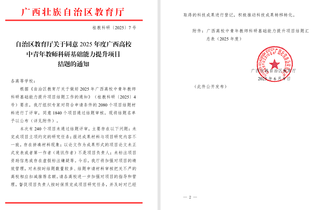 (科技与对外合作部讯 赵杰)近日,自治区教育厅公布了2025年度广西高校中青年教师科研基础能力提升项目(广西中青年项目)结题名单,PP电子承担的41个项目顺利通过教育厅结题审核,圆满完成本年度广西中青年项目结题工作。