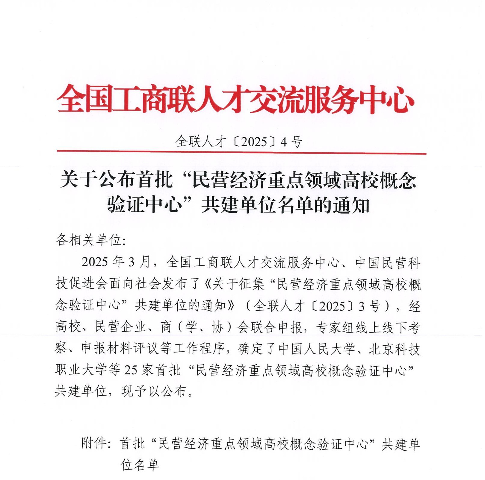 此次评选由全国工商联人才交流服务中心与中国民营科技促进会联合发起,旨在推动高校与民营企业深度融合,聚焦国家战略和民营经济发展急需的重点领域,通过建立概念验证中心,破解科技成果转化“最初一公里”的难题,加速创新链与产业链的精准对接。