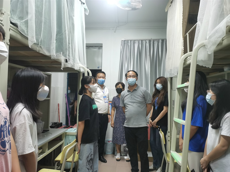 李校长一行先后走访检查学生餐厅、学生宿舍、核酸检测点等重点区域,详细询问开学第一天的情况,实地了解人员进出校园管控、现场核酸检测、学生宿舍管理及住宿情况等。