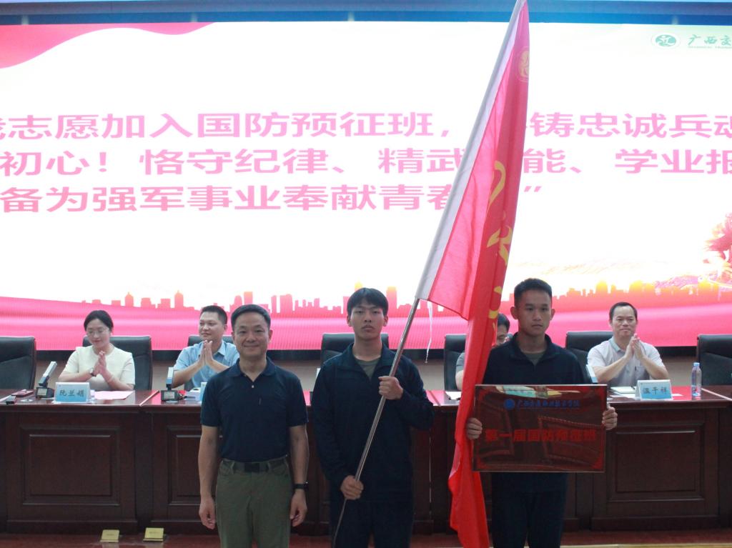 随后,举行学校首届国防预征班授旗授牌仪式。学校党委书记陈湘如为预征班授旗授牌。全体学员在班委带领下,紧握右拳,以铿锵誓言郑重承诺:“熔铸忠诚兵魂,砥砺报国初心!恪守纪律、精武强能、学业报国,时刻准备为强军事业奉献青春!”