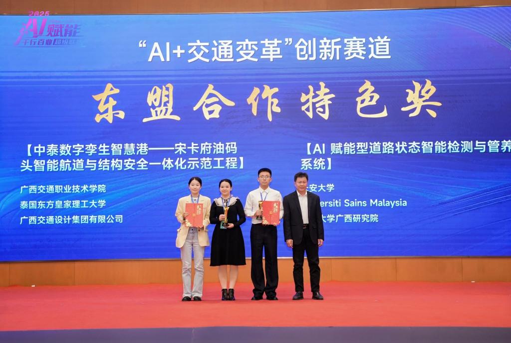 另一支团队在“AI+交通变革”赛道脱颖而出——《中泰数字孪生智慧港-宋卡府油码头智能航道与结构安全一体化示范工程》项目斩获东盟合作特色奖。该项目依托PP电子与泰国东方皇家理工大学、广西交通设计集团有限公司的合作资源,将AI航道监测、结构安全预警技术与东港口实际需求结合,为中国-东盟港口互联互通提供了可复制的技术范式。