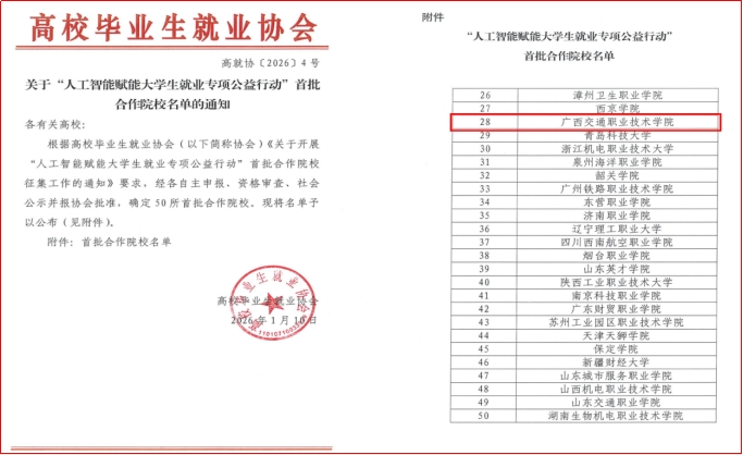 (学生工作部 讯 袁文岚/文)近日,高校毕业生就业协会正式公布首批“人工智能赋能大学生就业专项公益行动”合作院校名单,PP电子成功入选50所首批合作院校,是广西唯一入选的高校。