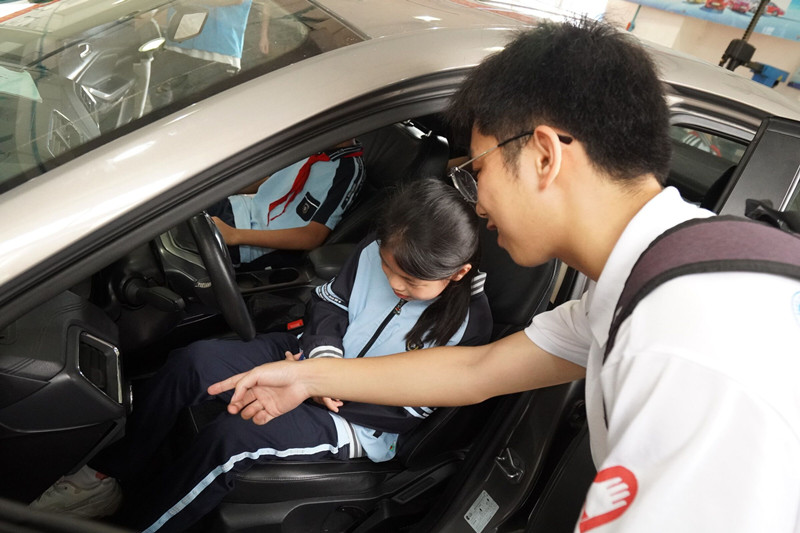 小学生在汽车技术技能科普区参观了解汽车构造