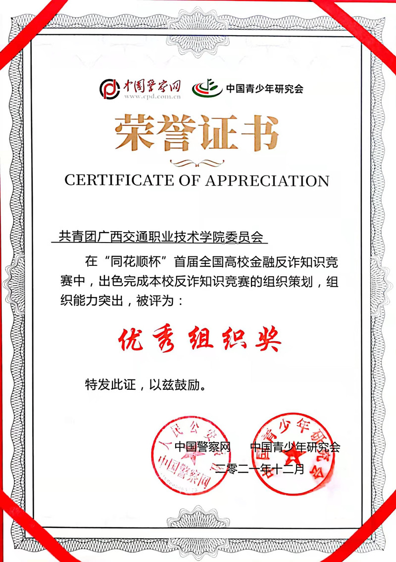 PP电子9000余名学生积极报名参与其中,与全国2500多所高校的24万余名学生一同参与线上竞赛,时刻绷紧防范之弦,谨防金融诈骗犯罪。最终,学校及学生工作部(处)、团委获评本次竞赛优秀组织奖;林波、容传毅获评优秀指导老师;新能源2020-2班付旭辉同学获评优秀组织者;轨道2021-2班谢璧光、轨道2021-2廖子健、轨道2021-2侯永祥、新能源2021-5班陆荣裕等4名同学获全国优秀奖(全国共表彰146名同学)。
