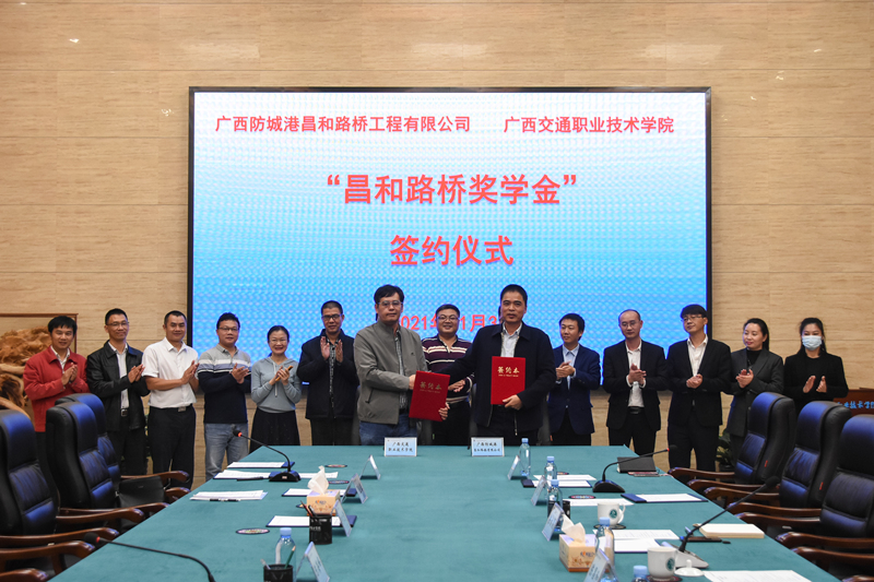 会上,陈海峰副校长与陈昌和董事长代表校企双方签署了合作协议。陈副校长代表学校向广西防城港昌和路桥工程有限公司赠送了“热心教育、造福桑梓”的牌匾。