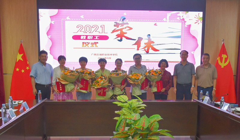 荣休仪式上,学校党委书记温宗胤、校长李文勇、总会计师谭雄为赵燕、郭永兰、刘湘蓝、陶勇、冯琪、韦羽六位荣休教职工颁发荣休证书,并送上献花。