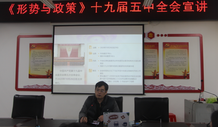 陈副校长强调,党的十九届五中全会是在即将实现第一个百年奋斗目标、开启全面建设社会主义现代化国家新征程的重要时刻召开的一次具有全局性、历史性意义的会议,学习贯彻党的十九届五中全会精神是当前和今后一段时期的重要政治任务。
