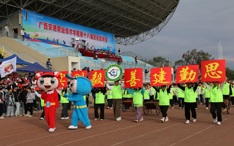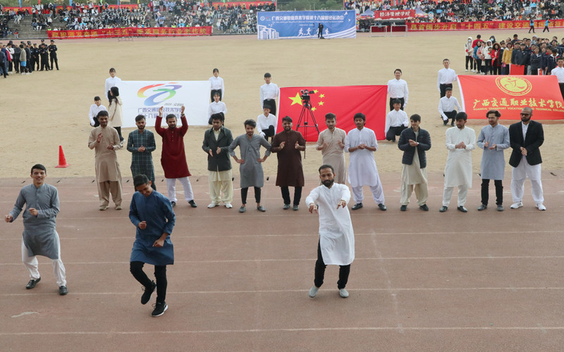 踏着青春的步伐,伴着激昂雄壮的进行曲,入场仪式正式开始。各二级学院仪仗队、学生运动员代表队及教职工代表队方阵迈着矫健的步伐,齐喊嘹亮的口号有序入场,接受主席台的检阅。他们朝气蓬勃、意气风发;他们的口号热情洋溢、铿锵有力,充满自信。尤其醒目的是首次参加运动会的东盟国际学院留学生代表队,16名来自泰国和巴基斯坦的留学生给师生们上演了精彩纷呈的异国舞蹈串烧,充分体现了留学生的体育精神面貌。