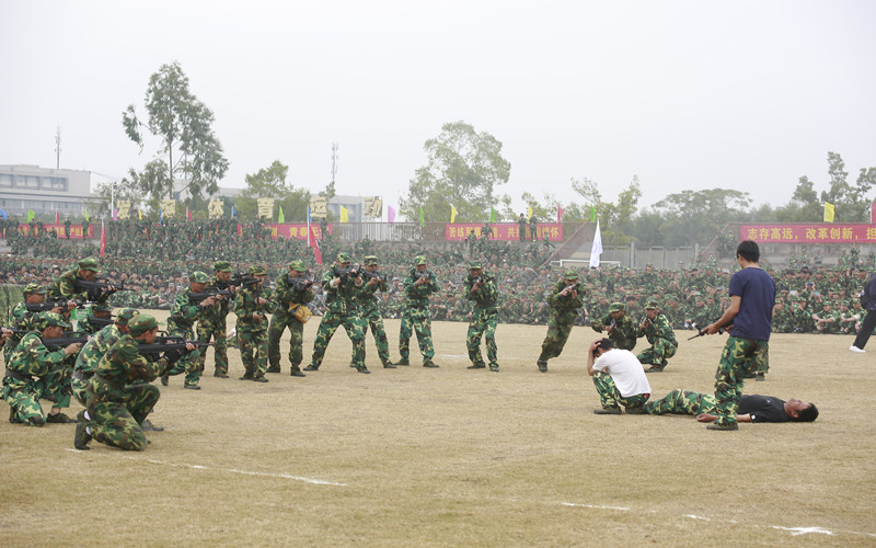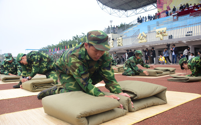 军事汇演节目在慷慨雄壮的军歌中依次亮相。军体拳、警棍术一招一式虎虎生威,匕首操、拳术招招出其不意。在叠军被节目中,同学们迅速把松软的被子叠成豆腐块,磨砺了学生的指力,腿功和耐性;反恐防爆模拟战术节目生动展示了军人为解救人质,不畏生死和“敌方”奋战到底的英雄气概和大无畏精神。现场如同电影大片,惊险刺激,演绎出了浓浓的战味,同学们精彩的表演赢得阵阵掌声和喝彩。