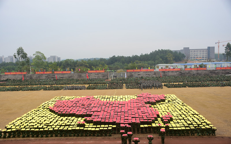 会场随处可见的参训爱国标语、响亮的军歌好口号、威严的教官和满眼的迷彩绿让会场充满了浓浓的军味。今年的亮点之一是方块队较往年人数翻了一番,由800人增至1500人,场面宏伟壮观,大气磅礴。方队内容除了展示具有交院特色的图案外,还特别结合疫情变换出国家版图、长城、党旗、白衣天使、口罩等元素,表达了对最美逆行者们保家卫国、守护人民的敬仰之情,同时参训学生高喊“我爱你,交院,我爱你,中国”“志存高远