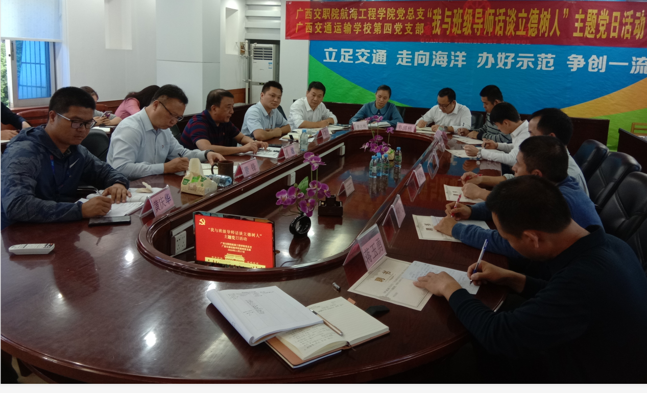 (航海工程学院党总支 讯 江丽萍/文、图) 11月17日,航海工程学院党总支与广西交通运输学校第四党支部在相思湖校区行政楼六楼会议室联合开展了“我与班级导师话谈立德树人”主题党日活动。学校总会计师谭雄参加了本次主题党日活动。