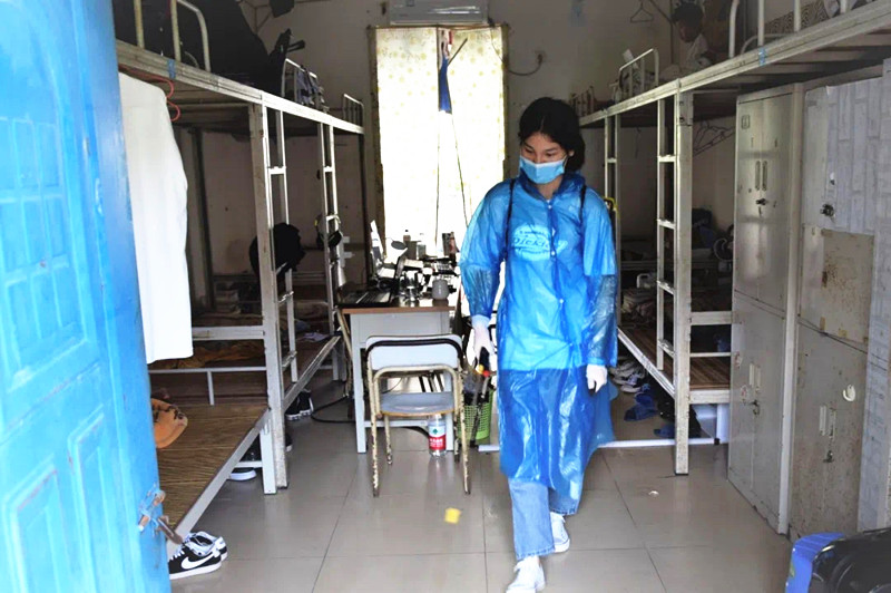 学生志愿者在宿舍内消毒