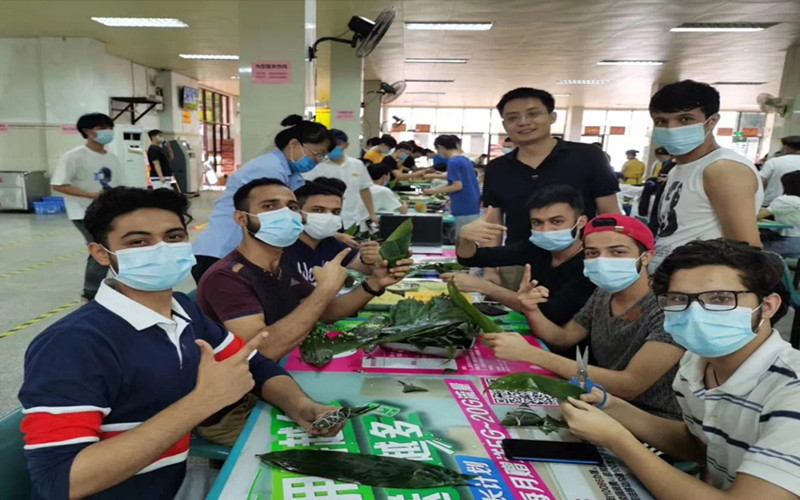 品味‘粽’香端午”系列活动中。看到第一次学包粽子的留学生动作不够娴熟,食堂阿姨和同学们耐心向他们传授包粽子、做香囊的技巧,一阵忙活之后,留学生们包出了各种形状的粽子,露出了开心的笑容。