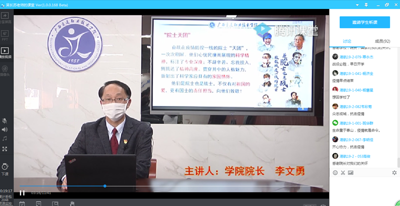 在思政课战“疫”小课堂中,温宗胤书记和李文勇院长将习近平总书记关于新冠肺炎疫情防控的重要讲话精神、党中央关于疫情防控的决策部署要求融入课程,通过全国各族人民众志成城、团结奋战的鲜活案例,生动讲述了中国共产党人的担当、中国人民的力量,将焦点问题与课本内容有效衔接,使全院师生众志成城抗击疫情的火热“战场”转变成高校思政教育的生动课堂。