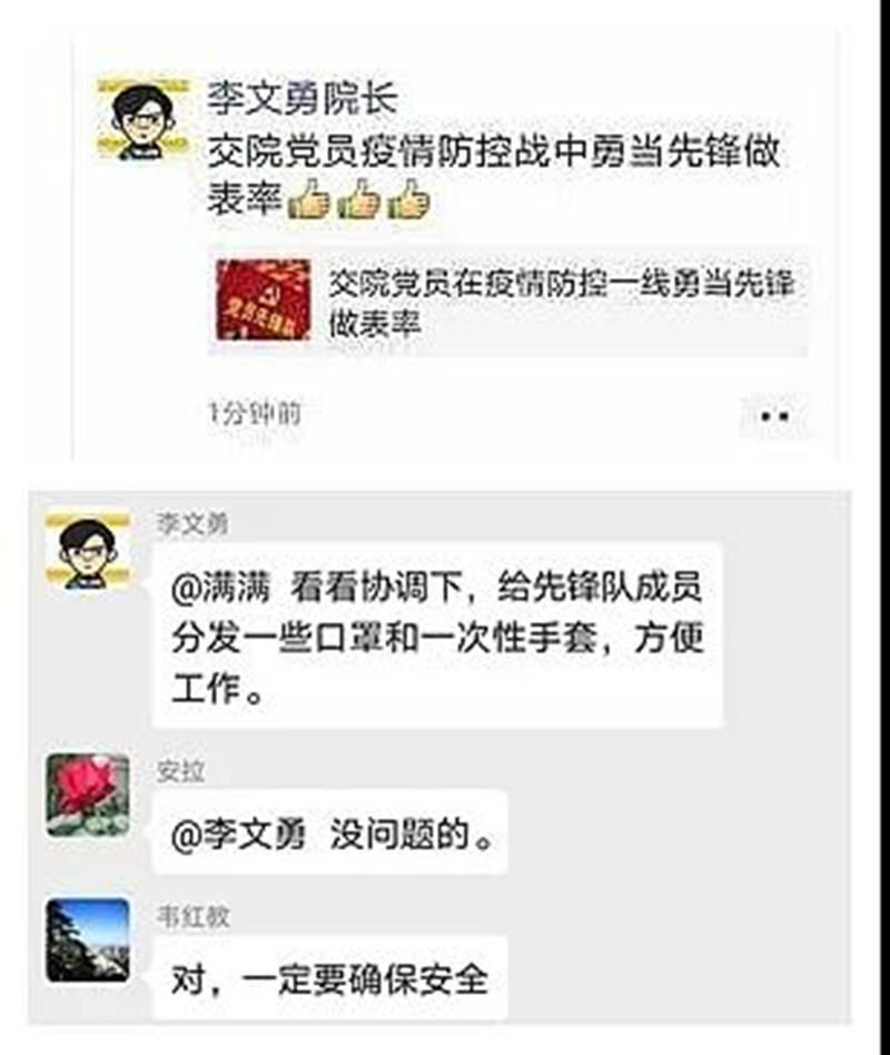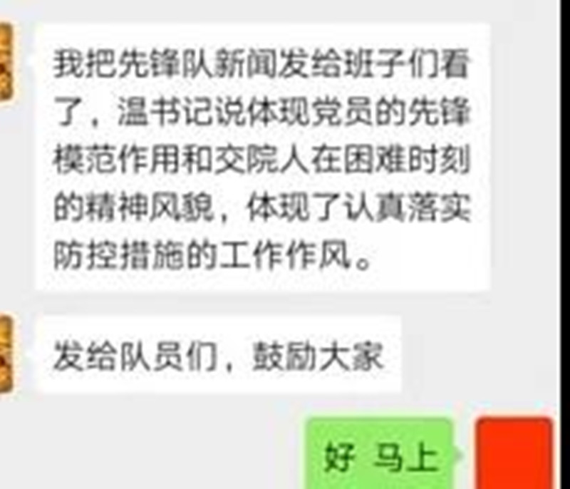 温宗胤书记一直关心关注党员先锋队的工作,给予了高度评价,认为大家的工作,体现了党员的先锋们作用和交院人在困难时刻的精神风貌,体现了认真落实防控措施的工作作风。