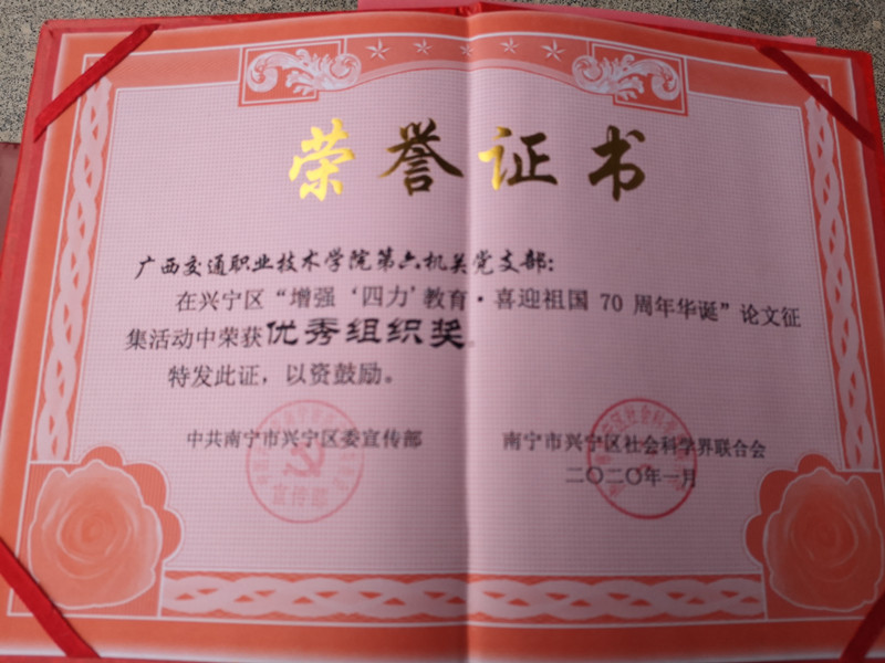 (科研处 讯)近日,学院获得从南宁市兴宁区宣传部传来的喜讯,在由兴宁区宣传部、社会科学界联合会共同举办的“增强‘四力’教育 喜迎祖国70周年华诞”主题征文评比中,我院三名教师取得佳绩,我院同时还获得了“优秀组织奖”。
