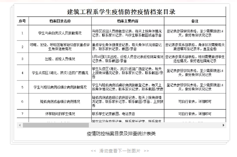 疫情未除,守土不退,守责不松。疫情爆发蔓延以来,建筑工程系迅速成立以系党总支负责人、系主任为组长的疫情防控领导小组,下设疫情排查防控等多个工作组,全面统筹部署疫情防控工作,动员带领全系师生贯彻决策,主动担责,守土尽责,有效的完成疫情防控既定工作。根据当前学院开学防疫工作部署,系部进一步完善组织机构,在做好疫情防控的同时,切实推进落实线上课堂,停课不停学等组织管理工作,落实线上办公模式,并通过线上平台,定期组织召开党总支、全系教师、学生班级工作会议,恢复实行一周一次学工例会制度,做到工作有计划、行动有组织、措施有成效。