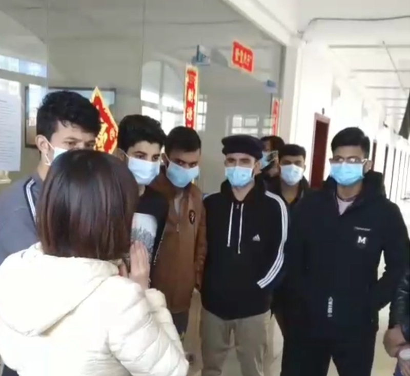 国际交流处、学校办公室负责人及国际学生班主任向国际学生说明了近期疫情扩散的情况,要求留校国际学生服从学院管理,平安、健康地度过春节。要求国际学生只在校园内活动,避免外出,并在公共场合佩戴口罩;日常要注意宿舍通风、干净、整洁;注意饮食,适当锻炼,增强身体素质。