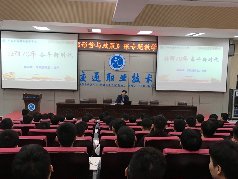 学院副院长陈海峰通过图文并茂的方式带领2018级汽检专业的学生回顾了我国在中国共产党领导下走过的70年非凡历程,重温了一个个载入史册的历史性变革、历史性成就。陈副院长指出,新时代大学生的使命,就是要做一个有理想、有担当、有本领的奋斗者和追梦人。