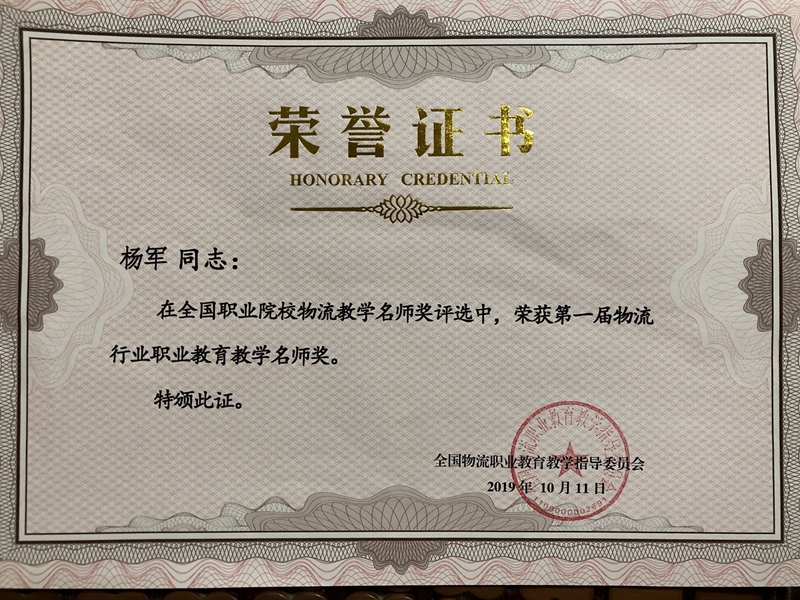 据了解,全国物流行指委于2019年6月-9月,组织开展了第一届“物流职业教育教学名师”评选工作,共收到成果申报材料286份。经学校推荐、专家评审、审核公示,最终确定46名教师为第一届物流行业职业教育教学名师。我院物流专业教师杨军喜获第一届物流行业职业教育教学名师奖。