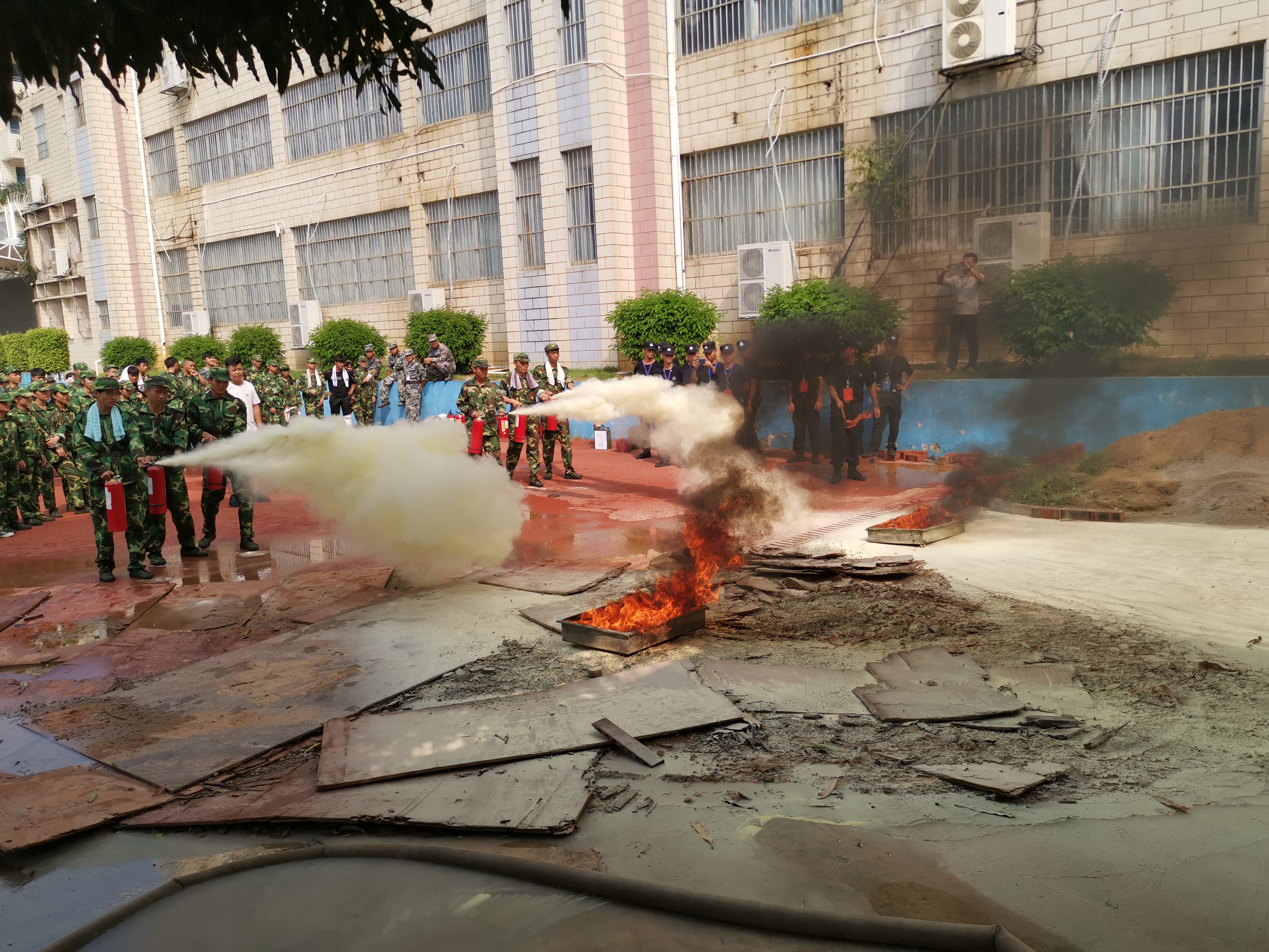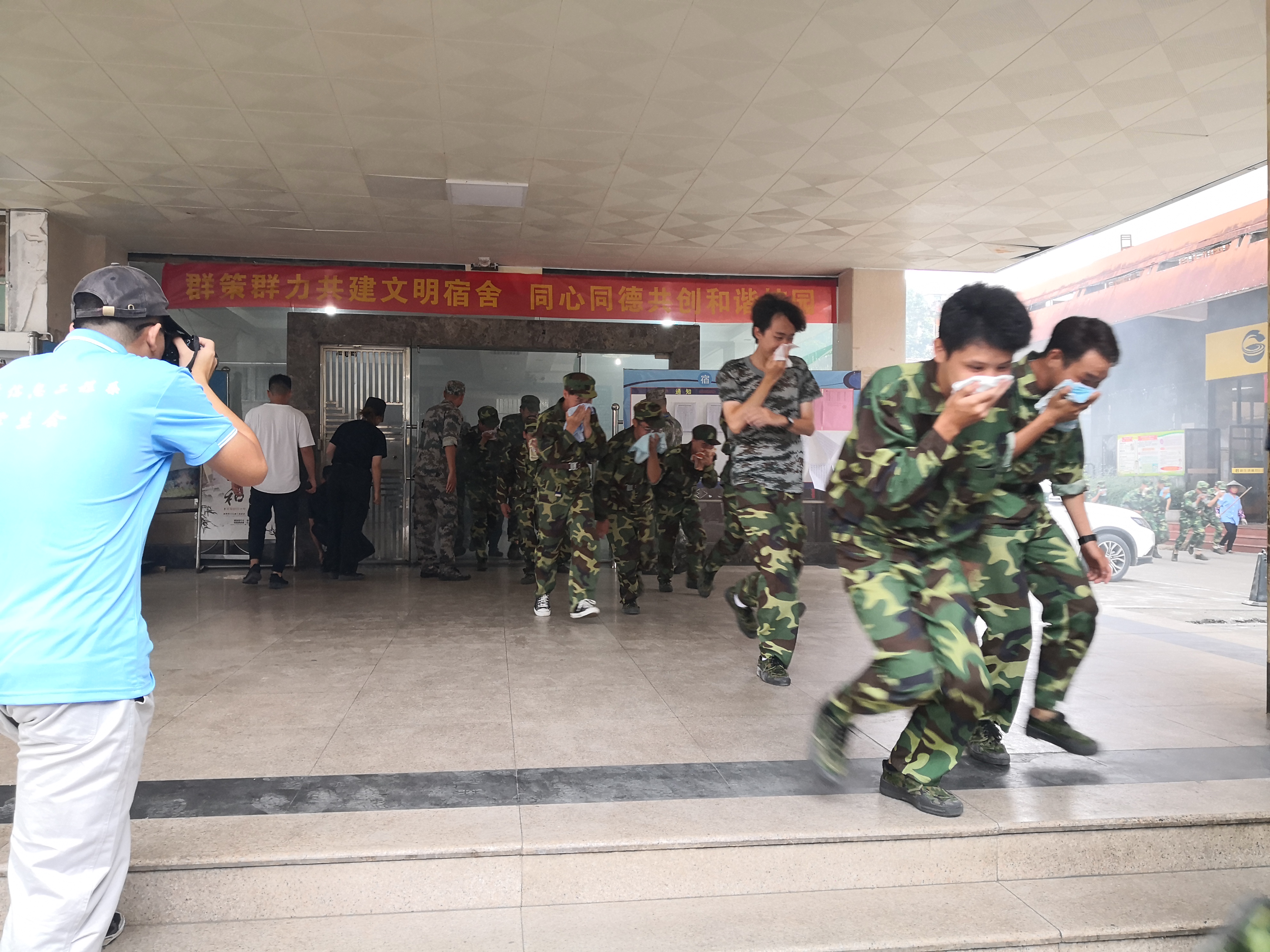 本次演练活动主要分为三个部分:第一部分是开展消防安全知识讲座。保卫处老师开展消防知识讲座,让学生充分了解日常生活中应如何预防火灾的发生、学生宿舍用电的安全事项、初起火灾的扑灭方法和火场逃生的注意事项。第二部分为消防逃生疏散演练。全体新生回到寝室听候疏散指令,学院义务消防队的队员在每栋宿舍楼通道点燃烟饼,宿舍内顿时浓烟滚滚。“着火了,请迅速撤离火场!”听到有人大声叫喊,各宿舍成员在宿舍长的带领下用湿毛巾捂住口鼻、俯下身子按照事先指定的逃生路线迅速地撤离宿舍区,军训教官、义务消防队员在各主要通道有序指挥,提醒大家手扶楼梯或墙面往安全的地方撤离,全体学生有序撤离到指定的应急避难场所,各宿舍长向班级负责人汇报人数。疏散过程中,学生反应敏捷、行动迅速,撤离井然有序,从疏散指令发出到集合清点人数的整个过程仅花了5分钟时间,符合预期效果。第三部分为灭火实操。逃生演练完毕,由保卫处老师向同学们讲解和演示干粉灭火器的使用方法:“拿到灭火器第一步要晃动瓶身,摇匀干粉,第二步拔掉插销、第三步一手握住灭火器的喷嘴、一手按下开关,站在上风向对准火根部喷……”随后由各系部班级宿舍长在军训教官的指导下体验灭火的操作流程。