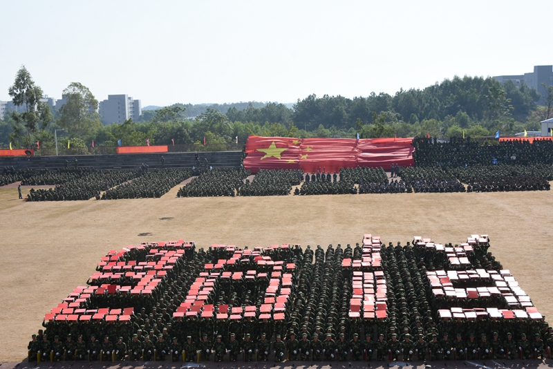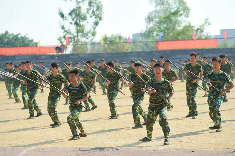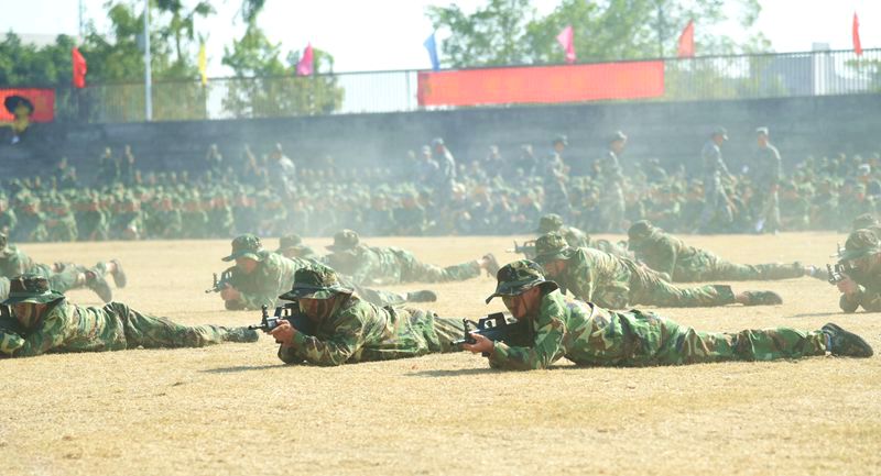 大会最令人振奋的莫过于由三营(管理系)近千名同学组成的大方阵进行队列操表演,同学们以整齐划一的动作变幻出各种造型,震撼全场。还有惊险刺激的战术表演,配合烟雾弹、震爆弹、火圈等,高度还原战场实况,场面震撼,同学们不畏困苦勇猛持枪行进,单腿跪姿射击、前滑转身射击等战术动作,向大家展示了枪战术精神和各种枪战技巧,让人眼前一亮,点燃全场。其他2个方阵的刺杀术、棍术表演也十分精彩,赢得了现场阵阵喝彩,最后在响亮的“志存高远、改革创新、担当实干、追求卓越”的交院精神口号声中圆满完成军训会操表演。