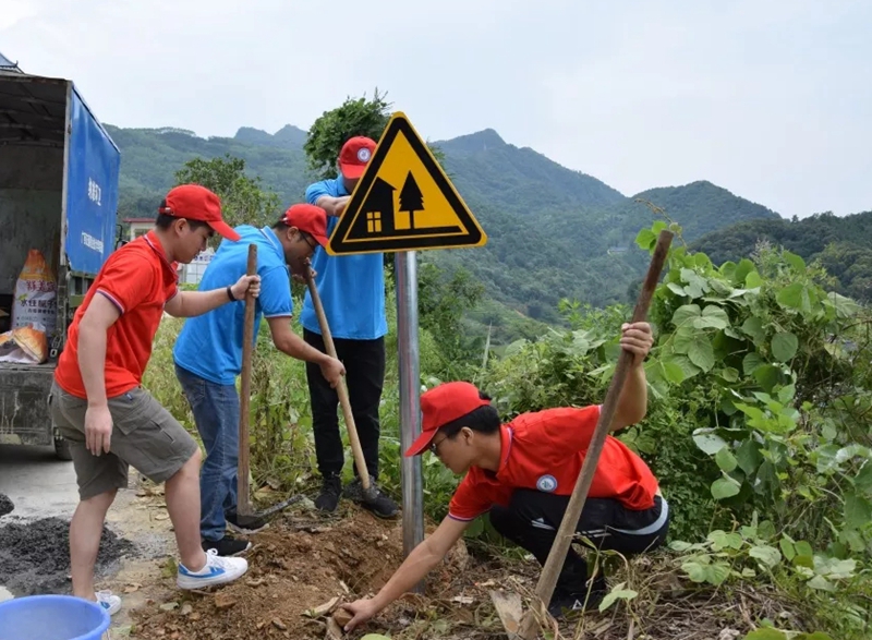 志愿者们安装交通安全标志