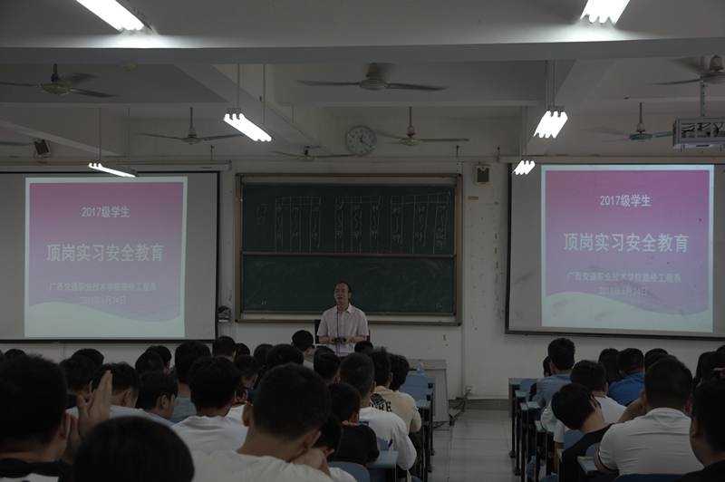 本次安全月活动上,莫品疆主任韦秋平书记首先率全体教师赴大塘至浦北高速路的中建八局安全体验馆参观和体验,并在全系各场所检查安全隐患;在各班级顶岗实习宣讲会上,莫品疆主任、韦秋平书记、黎群、覃峰副主任均以“走进工作岗位如何做好第一步”为切入点来展开此次教育会,希望同学们进入实习单位能遵守企业规章制度,在工作岗位上勤勤恳恳,履行好工作职责,将在校所学的理论知识、专业技能运用到实际的工作中。黎主任还对当前的就业形势进行了详细的分析,让同学们时刻绷紧就业的弦,并就未来如何实现有效就业的问题提出许多中肯的建议。随后,在安全方面提出几点要求:一是着重强调在实习过程中,同学们要严格服从实习单位的管理,按时按质按量撰写实习日记和实习总结;二是时刻保持电话通畅,有问题要及时与学校指导老师和辅导员联系,不可擅自做主或离岗;三是在工作中要时刻将“安全第一”印入脑中,保证自身的安全。 黎主任还补充道,安全是每一个人的责任,尤其本月作为PP电子“安全活动月”,系部领导高度重视各方面的安全,从校外的顶岗实习到校内同学们的实训、系部副楼每一间办公室、轨道实训中心、实验室、教室到学生宿舍区各个领域,都一一进行检查巡视,并提出整改的措施,有效避免各类安全事故的发生。