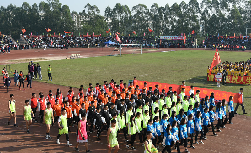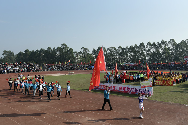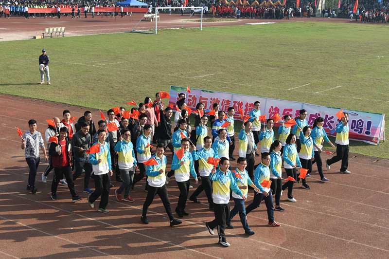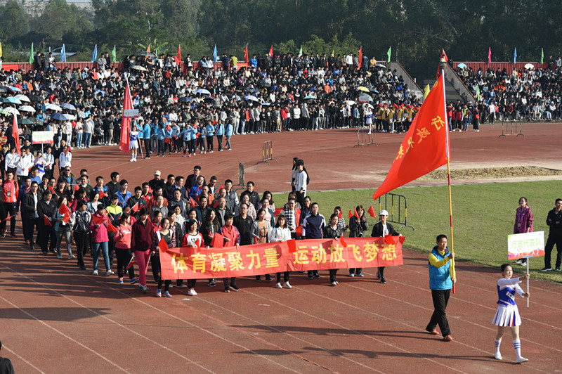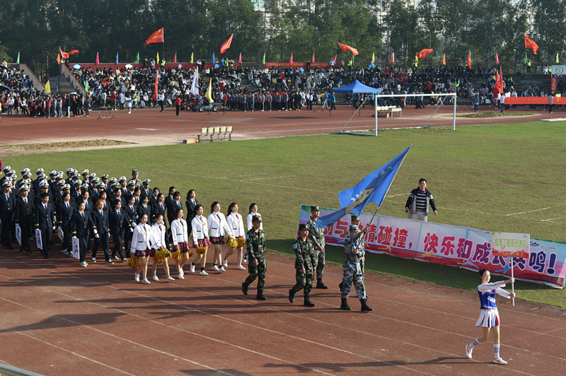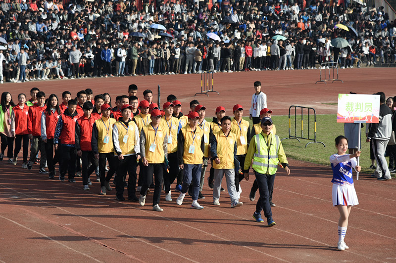 在激昂向上的《运动员进行曲》旋律中,国旗、院旗、会旗护卫队率先进场,随后,各系部仪仗队、学生运动员代表队及教职工代表队按照既定序列入场。各代表队迈着有力的步伐,喊着响亮的口号,依次通过主席台,彰显青春风采。