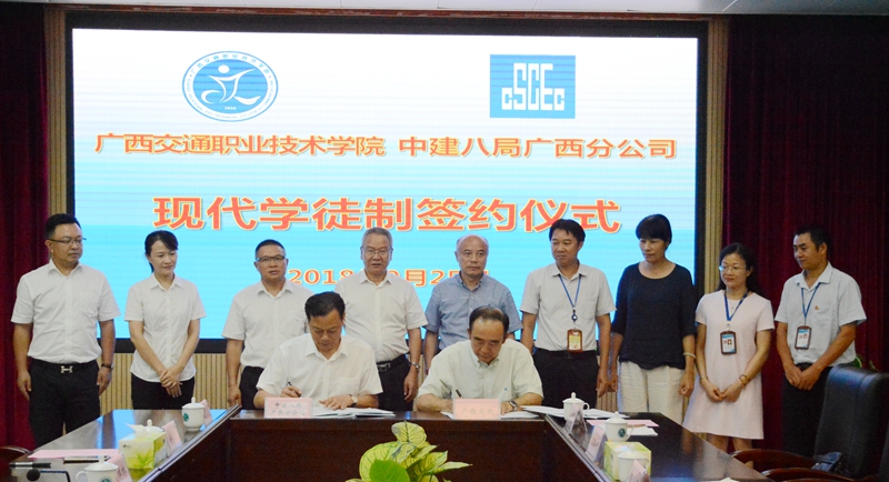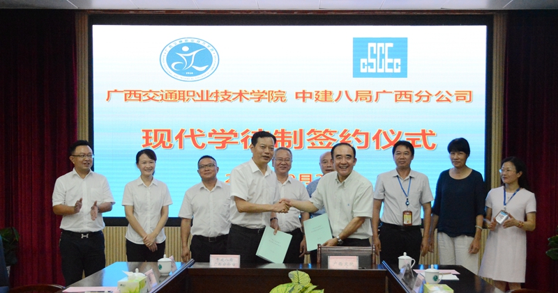 签约仪式上,程轮院长向中建八局广西分公司的领导介绍了我院的历史沿革、办学理念、现代学徒制人才培养的发展历程等。他指出,自2015年我院获得了国家首批现代学徒制试点项目后,与广西路建工程集团签订现代学徒制人才培养协议,经过两年多的探索和实践,建立了校企联合招生、联合培养、招生与招工一体化、校企协同育人的长效机制,建立了与现代学徒制相适应的管理制度、课程体系、师资队伍等内容,积累了较丰富的现代学徒制人才培养经验,取得了明显成效。同时,程院长表示,校企双方合作对于推进学院与中建八局广西分公司在教育教学培训、科研技术攻关、工艺工法创新等方面的合作起到积极的促进作用。