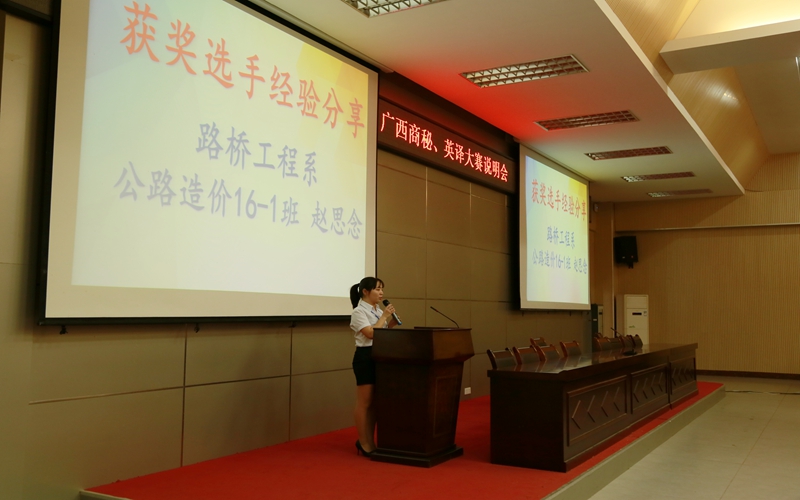 会议介绍了广西商务英语翻译大赛和广西商务秘书大赛的基本情况,围绕比赛的重要性、形式、规则、注意事项等内容就广西第十二届商务秘书大赛和广西第三届商务英语翻译大赛赛事进行详细解说,鼓励学生们以赛促学、以赛促提高,通过大赛学习新知识,并合理运用到学习、生活、工作中。