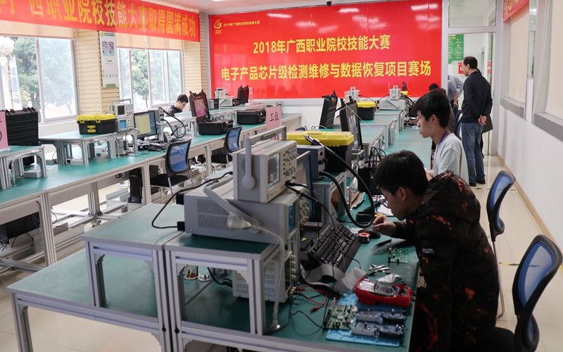 3月26日,2018年广西职业院校技能大赛电子产品芯片级检测维修与数据恢复赛项(高职组)在学院园湖校区进行比赛。电子产品芯片级检测维修与数据恢复赛项以电脑主板芯片级维修及硬盘数据恢复技术为载体,将电子产品芯片级检测维修与数据恢复的前沿技术及技能融入比赛内容,主要检验选手在模拟真实的工作场景下对电子产品芯片级检测维修及数据恢复的技能和综合职业素养,为行业、企业培养紧缺人才,提高电子信息类高素质、高技能应用型人才的培养质量。