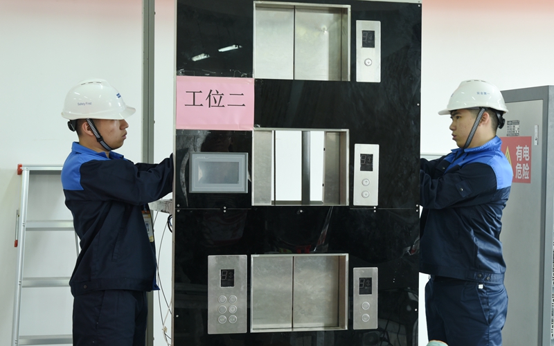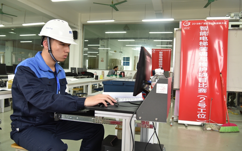 3月26-27日,2018年广西职业院校技能大赛智能电梯装调与维护赛项(高职组)在学院四塘校区开赛。本次比赛为团体赛,采用理论、技能相结合的方式同步进行。比赛中,每个参赛队的比赛时间为5小时,参赛选手需合理安排理论和技能竞赛时间,完成1份理论试卷,并在指定场地进行电梯控制技术综合实训操作,协同完成电梯电气控制原理图设计与绘制、电梯机构安装与检测装置调整、电梯电气控制柜器件的安装与线路连接、电梯控制程序设计与调试、电梯故障诊断与排除和电梯运行调试与保养。各参赛队严格遵守赛事安排,克服了赛时长、赛项任务重、操作工序难等各类因素,认真完成了竞赛内容。