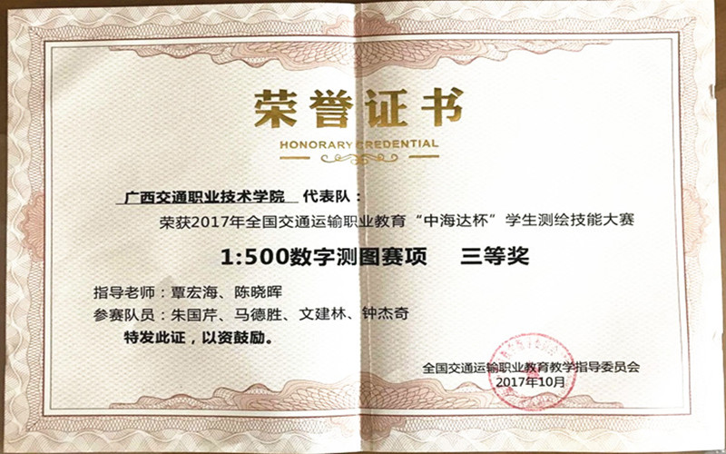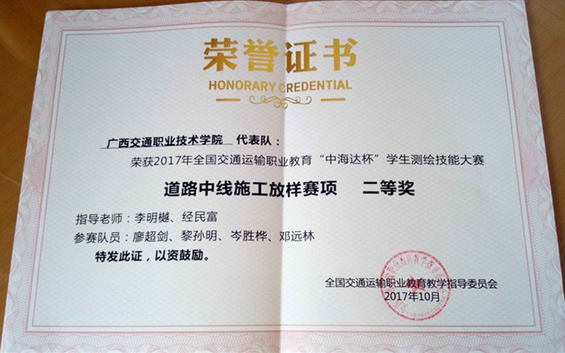 (路桥工程系 讯 李振成/文) 近日,由全国交通运输职业教育教学指导委员会主办、路桥工程类专业指导委员会承办的2017年全国交通运输职业教育“中海达杯”学生测绘技能大赛在四川交通职业技术学院落下帷幕。我院路桥工程系学生代表队在比赛中喜获一项二等奖、两项三等奖。