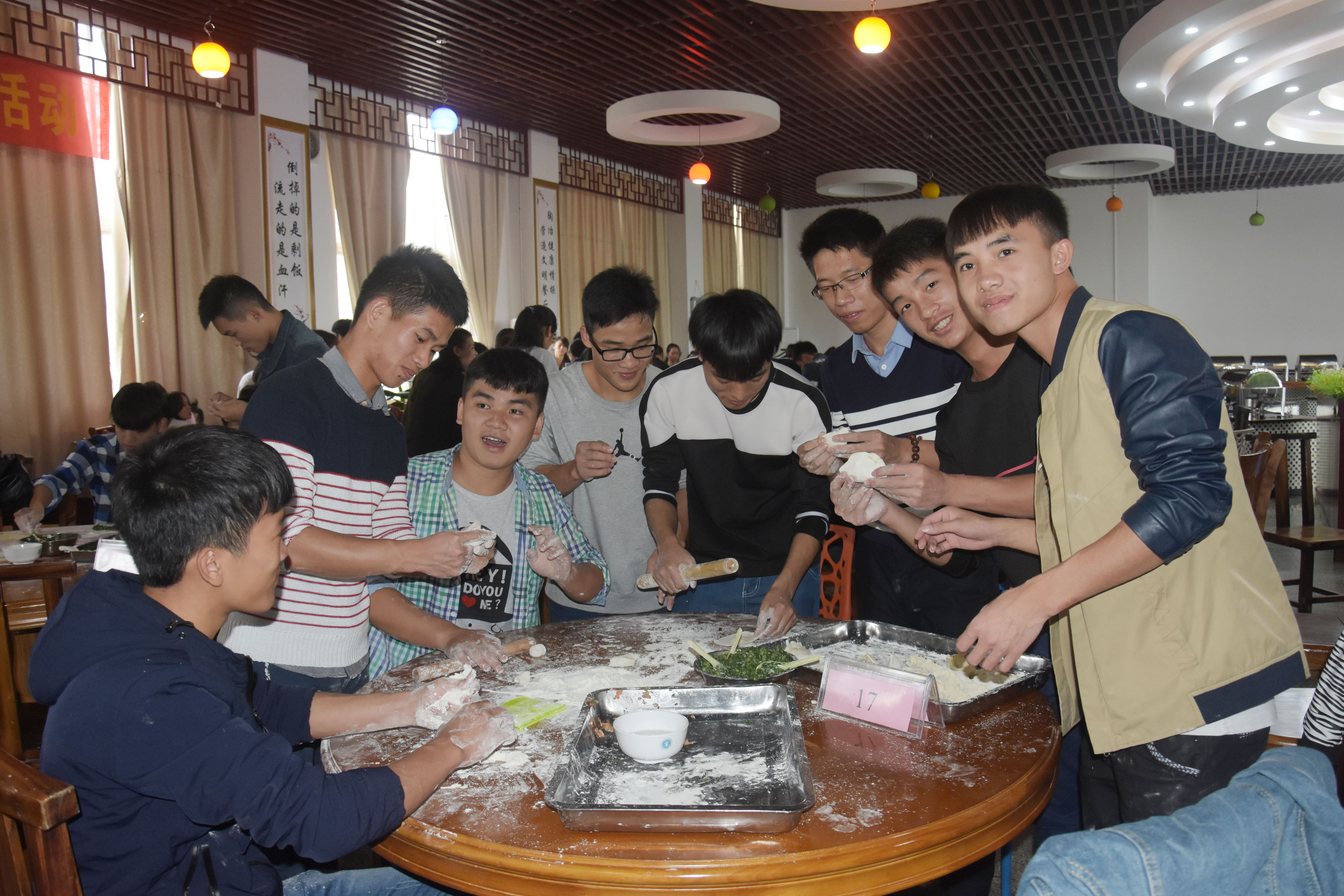 当天下午,北区食堂二楼餐厅挤满了包饺子的师生,大家都热情高涨,老师同学们围坐在一起,8到10人一组,共分为20组。在包饺子过程中,有的学生和面、有的学生擀皮、有的学生包陷,分工明确,现场还邀请了食堂的厨师现场教学,耐心指导。大家围绕学习、生活、工作等话题愉快交谈,欢声笑语不断,齐心协力、精诚合作,一行行独具特点的饺子很快就摆满了数个盘子。当一盘盘热气腾腾的饺子端上餐桌,吃着自己包的香喷喷的饺子,同学们感受到了节日的快乐和大学生活的温暖。