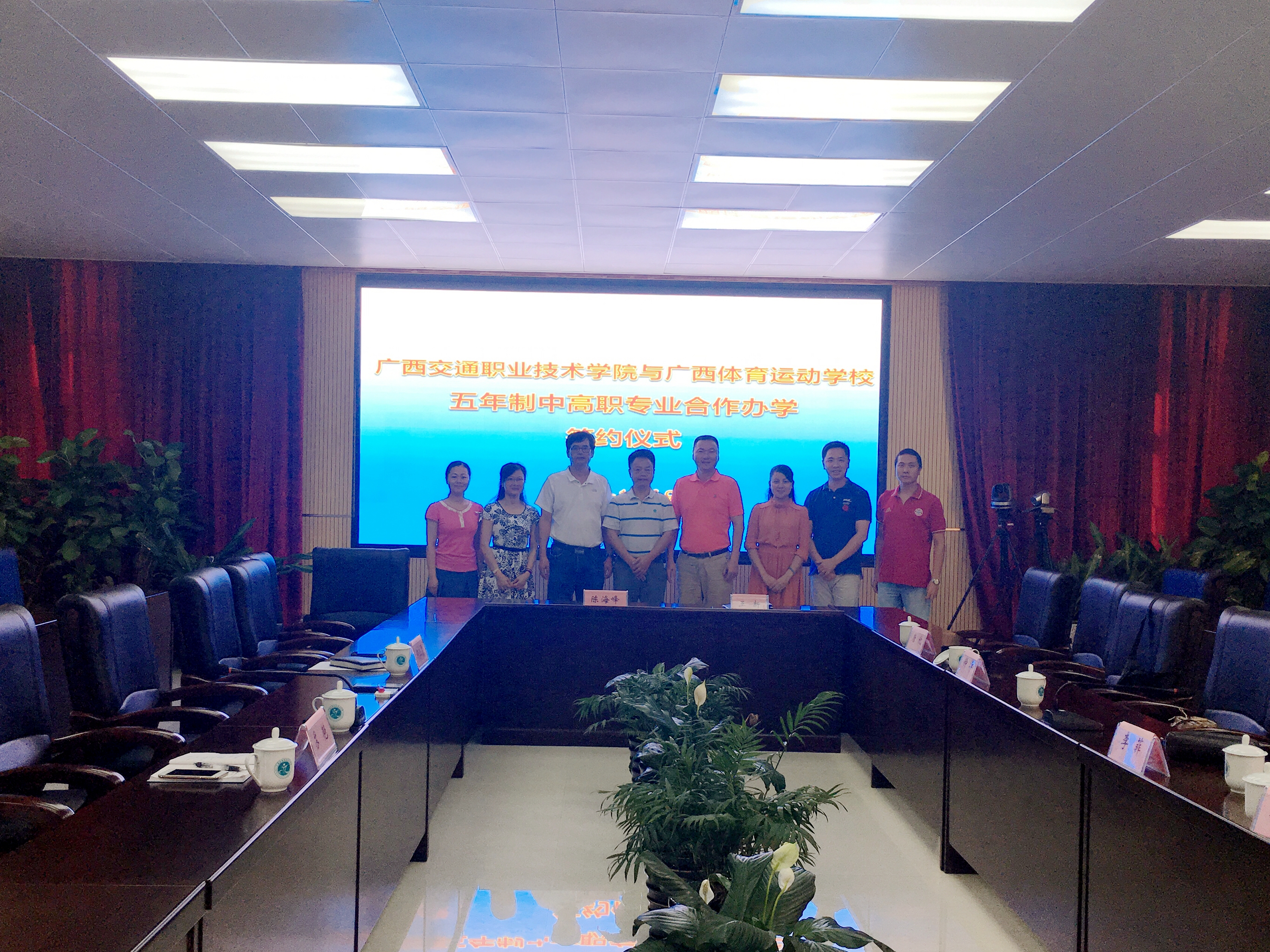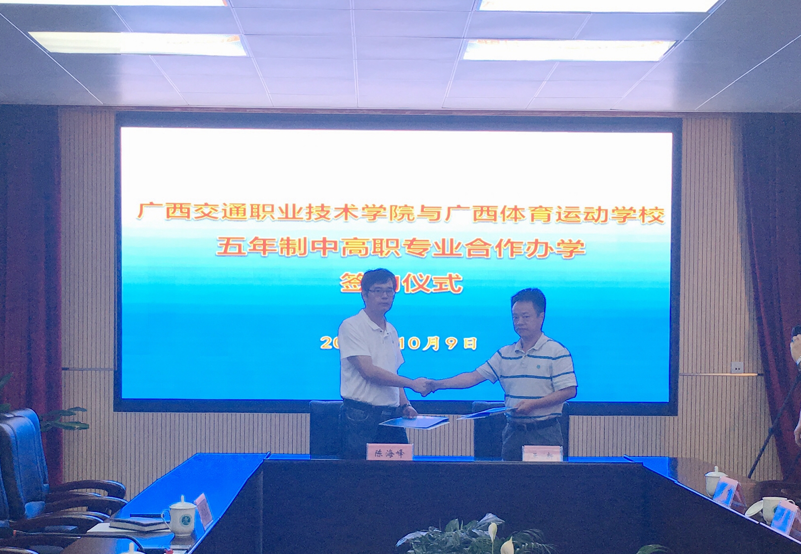 (招生就业处 讯)10月9日上午,广西体育运动学校一行5人到我院洽谈五年制中高职衔接合作事宜,并与我院签订了五年制中高职衔接合作办学协议。学院陈海峰副院长、广西体育运动学校王新校长、李菲副校长以及两校相关部门负责人出席了签约仪式。