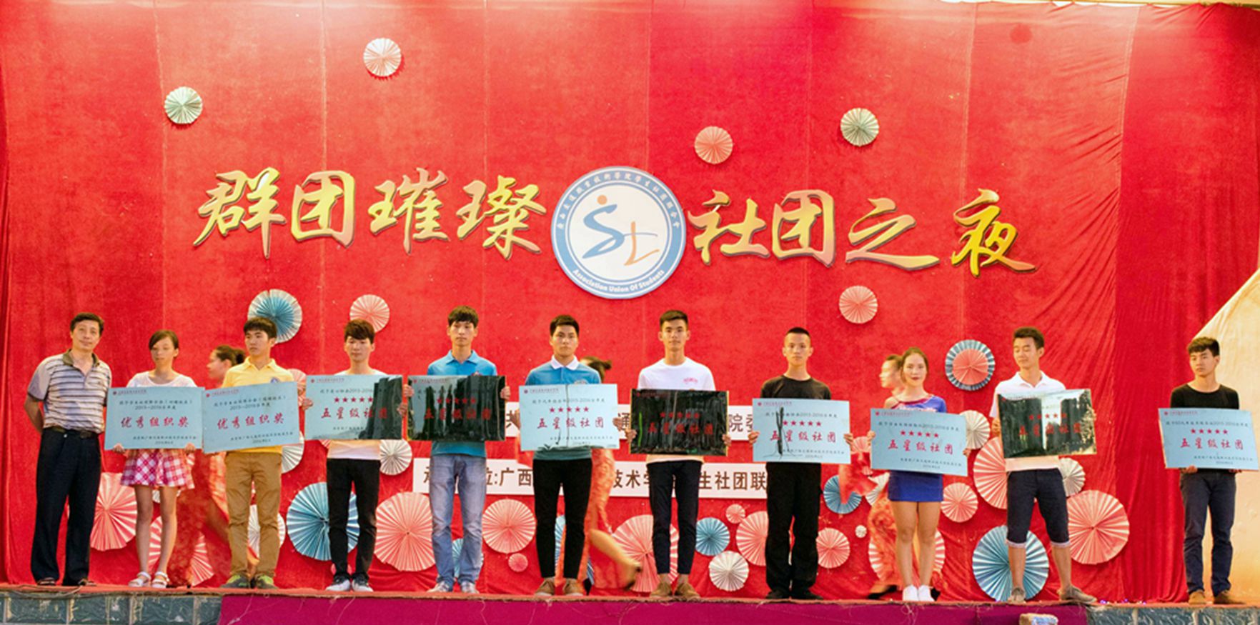 颁奖晚会上,精彩的节目表演与颁奖穿插进行。汽车俱乐部、爱心协会、啦啦操协会等8个社团荣获“五星级社团”称号、四塘、园湖学生社团联合会获得“最佳组织奖”称号;26-UP英语俱乐部、路桥测量协会、大学生通讯社等9个社团荣获“四星级”称号;数学建模协会、演讲与口才协会、醒狮协会等9各社团荣获“三星级”称号。莫跃宁处长为获得“五星级社团”称号的集体颁发了牌匾。
