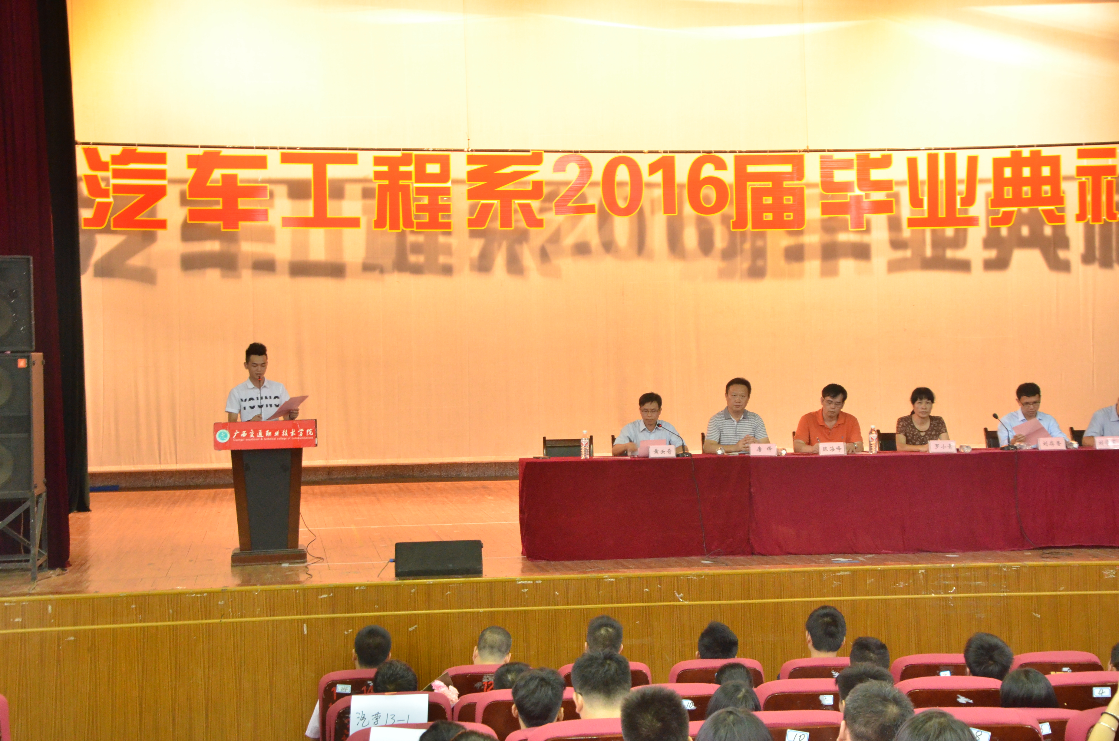 典礼上,汽车系刘存香主任也给予毕业生寄语和祝福。系副主任刘学军宣读了毕业班优秀班级、三好学生和优秀学生干部名单,并予以表彰。在欢乐的背景音乐中,陈海峰副院长和系部领导为汽车工程系2016届的毕业生颁发了毕业证书。